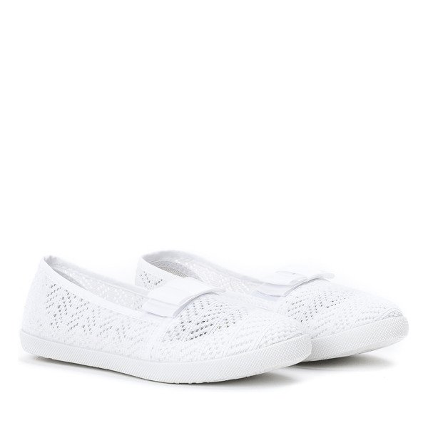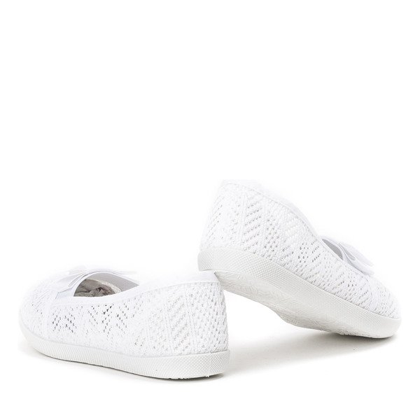 • Dievčenské biele slip on tenisky. Zvršok a stielka sú vyrobené z látky. Tenisky sú zdobené mašličkou. Prezentovaná detská obuv má navyše gumovú vložku, ktorá uľahčuje vloženie chodidla do topánok.