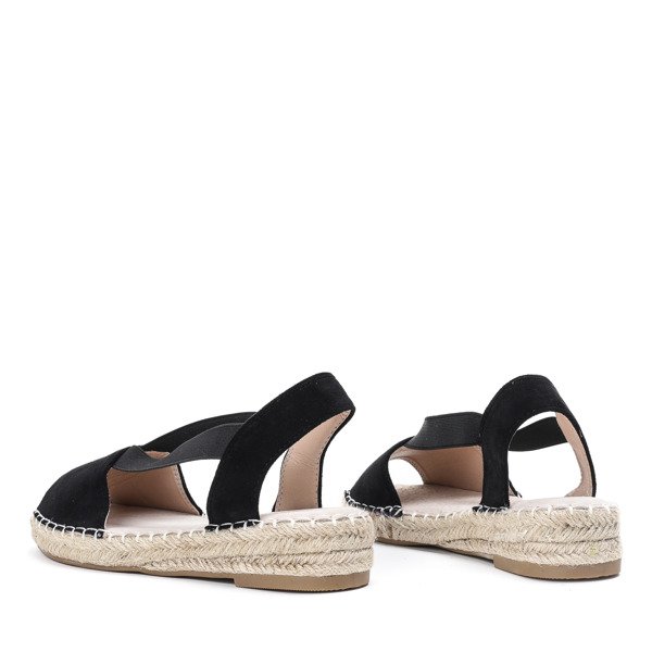 - Čierne sandále na nízkej platforme. Predné a zadné remene sú vyrobené z eko semišu, ďalšie dva remene sú gumené. Stielka je pokrytá ekokožou. Podrážku prezentovaných dámskych topánok zdobí jutová pletená šnúrka.
