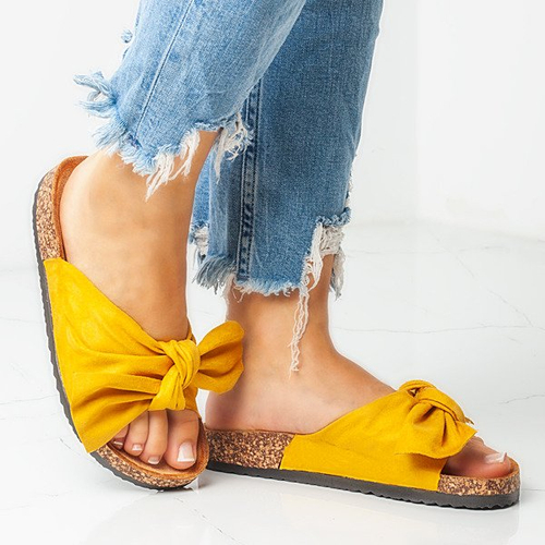 - Klasyczne klapki z kokardką wykonane ze skóry ekologicznej zamszowej. Model w kolorze żółtym o odcieniu musztardowym. Wkładka również pokryta miękkim eko - zamszem. Podeszwa z połączenia tworzywa gumowego oraz korka. Obuwie damskie idealne do sukienek.