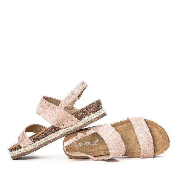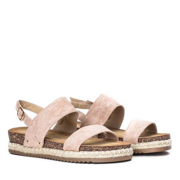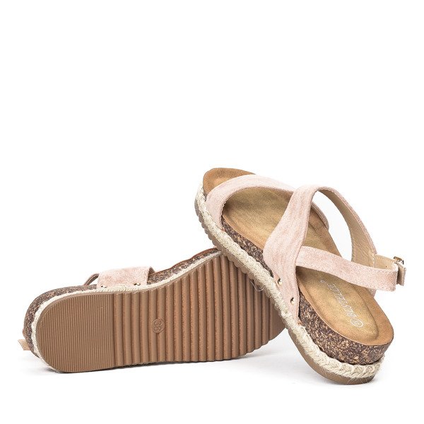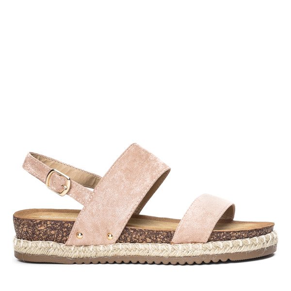• Sandały wykonane ze skóry ekologicznej zamszowej w kolorze różowym. Buty na niskiej korkowej podeszwie, która zdobiona jest plecionym jutowym sznurkiem. Obuwie damskie zapinane na sprzączkę. Bardzo wygodna i miękka wkładka ze skóry ekologicznej.
