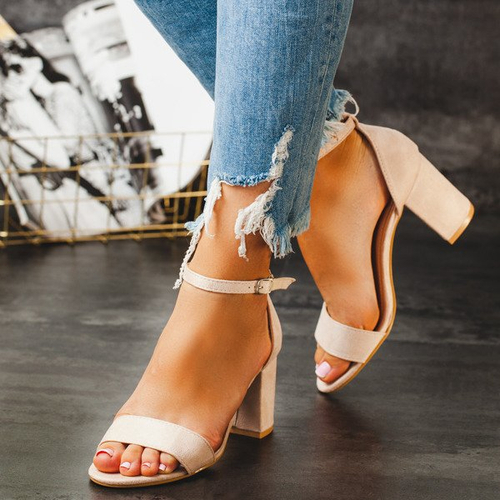- Eleganckie sandały na słupku wykonane ze skóry ekologicznej zamszowej w kolorze beżowym. Model zapinany sprzączką na wysokości kostki. Te obuwie damskie będzie świetnym dodatkiem do sukienek.