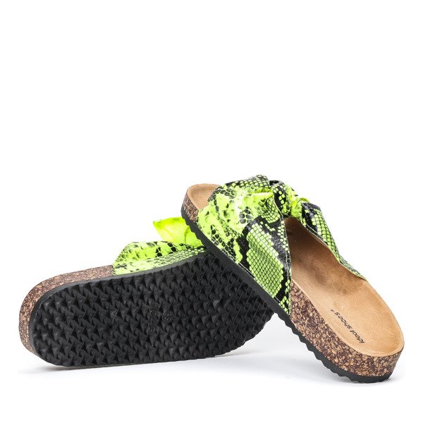 - Klasické hrubé papuče s podrážkou s mašličkou. Dámske topánky sú vyrobené z neónovo zelenej ekokože napodobňujúcej vzor a textúru hadej kože. Stielka je pokrytá príjemným na dotyk eko semišom. Perfektné pre každodenný styling!