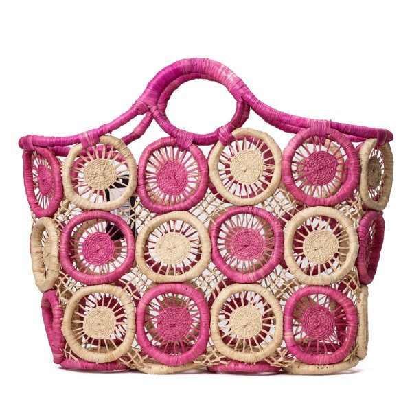 - Neuvěřitelně stylová taška ze tkané papírové slámy. Dvě kliky nahoře. Model vypadá růžově a béžově. Ideální pro letní stylizac