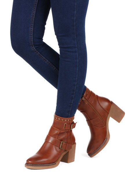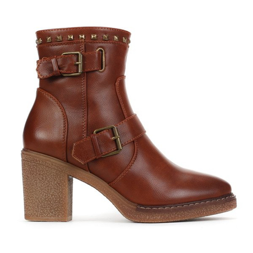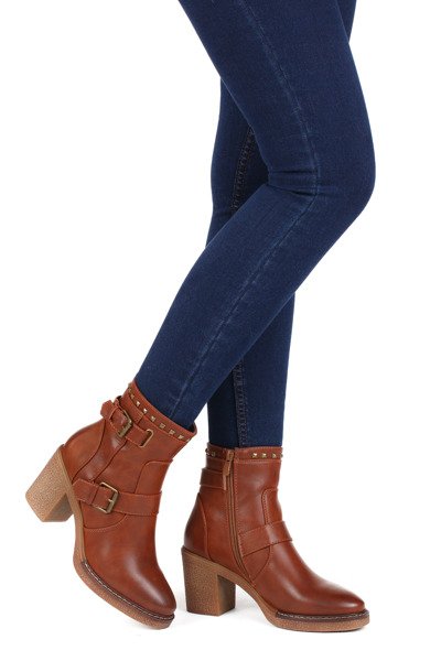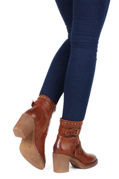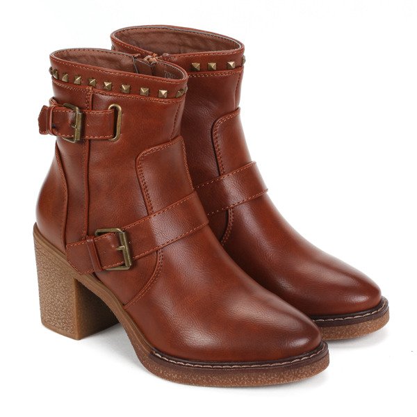 • Botki na słupku, wykonane ze skóry ekologicznej. Na cholewce znajdują się srebrne ćwieki. Buty zapinane zamkiem z boku, posiadają dwie ozdobne klamry. Doskonale prezentują się z jesiennym płaszczem oraz jeansami.