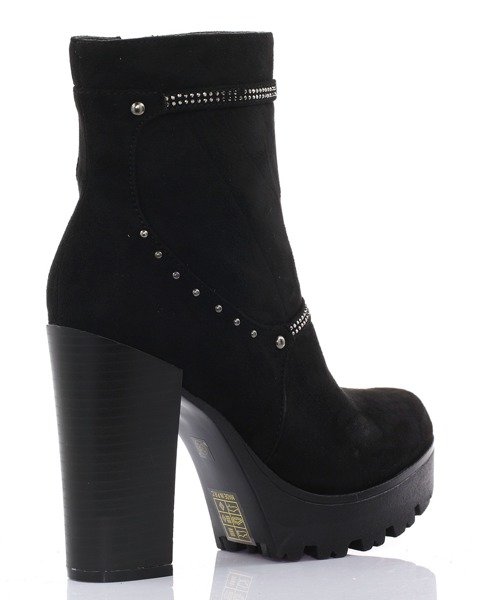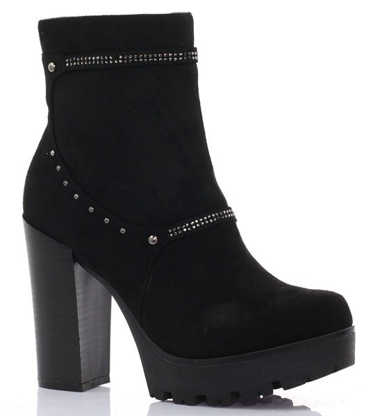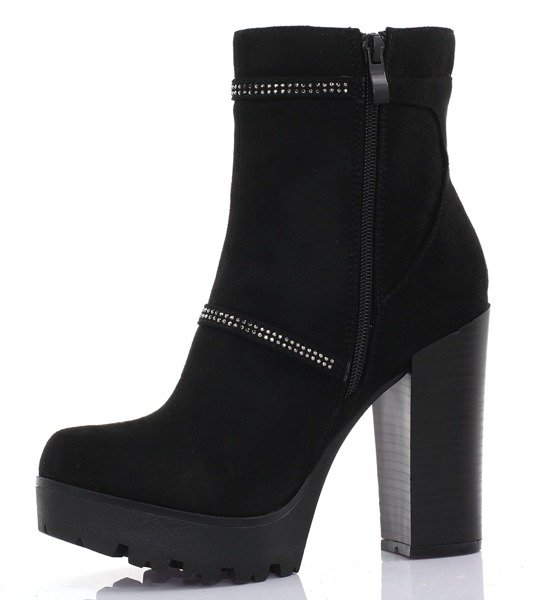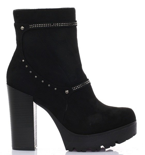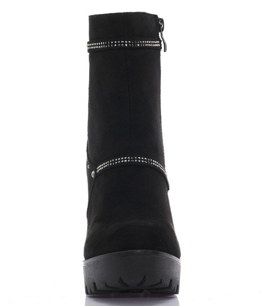 • Śliczne botki z ekologicznego zamszu zasuwane na suwak. Cholewka zdobiona świecącymi dżetami oraz cyrkoniami. Idealne na chłodniejszą porę roku.