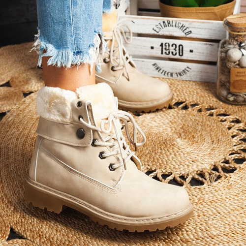 - Sznurowane trapery na płaskim obcasie wykonane ze skóry ekologicznej matowej w kolorze beżowym. W środku posiadają ocieplenie w formie futerka. Te buty damskie będą idealnym dodatkiem na chłodniejsze dni.