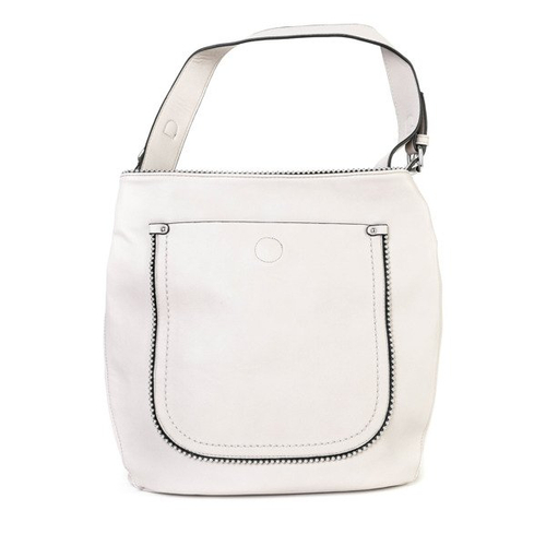 - Szara torba na ramię zapinana suwakiem wykonana ze skóry ekologicznej. W przedniej części mała kieszonka zapinana guzikiem, zaś w tylna kieszonka zapinana na suwak. W środku posiada dwie przegrody oraz cztery kieszonki w tym dwie zapinane na suwak.