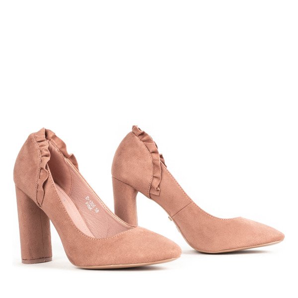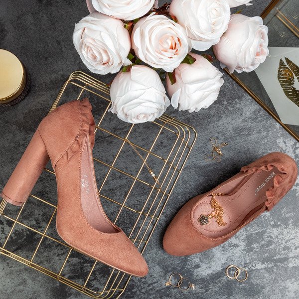 • Elegantní čerpadla na stabilním růžovém sloupku. Svršek z ekologického semiše, zdobený volánkem. Stélka je potažena ekologickou kůží. Kromě toho mají měkké podložky pod nohama.