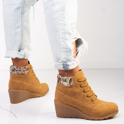 Brązowe botki na koturnie z beżową wstawką w kwiaty Marona - Obuwie