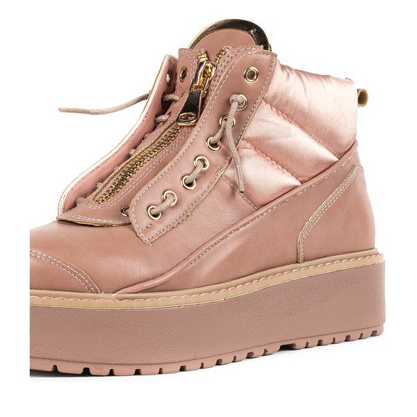 - Sportowe damskie botki w kolorze różowym wykonane ze skóry ekologicznej. Model na grubszej platformie. Cholewka posiada ozdobne wiązanie oraz suwak na nosku. W środku wkładka z materiału tkaninowego.