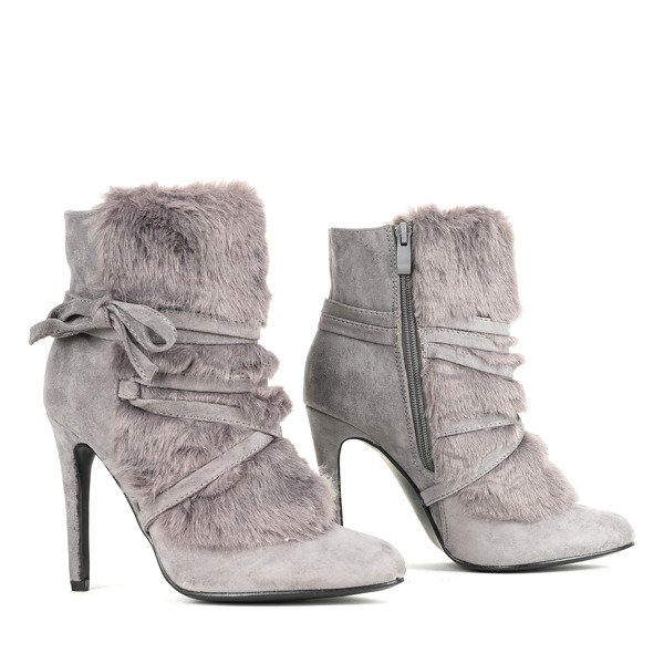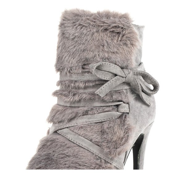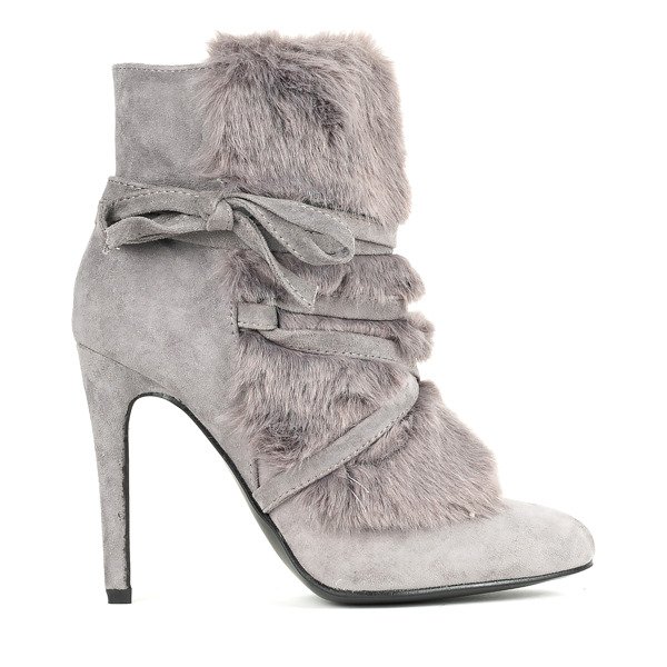 - Stylowe buty damskie na szpilce wykonane z ekologicznego zamszu w kolorze szarym. Cholewka wykończona miękkim w dotyku futerkiem. W środku posiadają delikatne ocieplenie. Z boku zapinane są na suwak.
