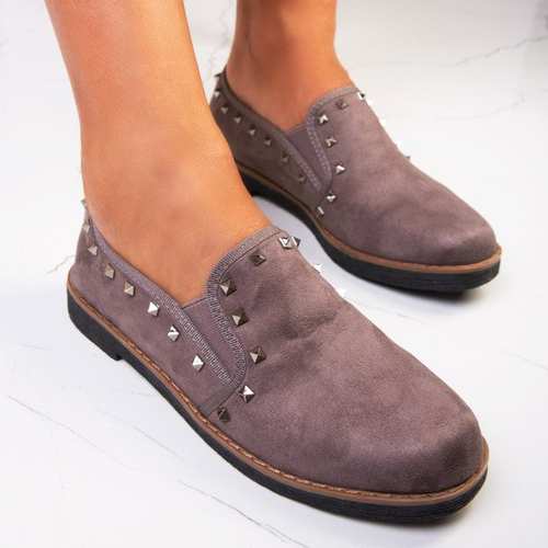 - Półbuty na płaskim obcasie z okrągłym noskiem. Obuwie jest wykonane z eko-zamszu w kolorze szarym. Wnętrze buta pokryte eko-skórą, dodatkowym atutem jest miękka wkładka. Buty posiadają ozdoby w formie ćwieków. Doskonałe do codziennej garderoby!