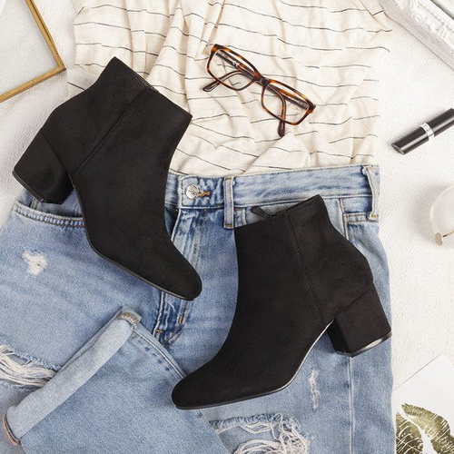 • Klasyczne botki na stabilnym słupku wykonane z eko-zamszu w kolorze czarnym. Obuwie jest zapinane na suwak po wewnętrznej stronie. Wkładka oraz wnętrze buta pokryte tkaniną. Ten model będzie doskonałym dodatkiem do wielu stylizacji!