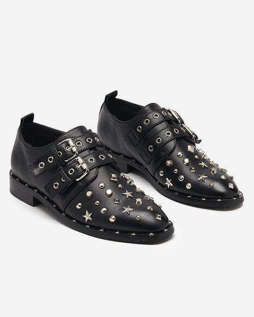 - Čierne topánky na nízkych podpätkoch vyrobené z ekologickej kože. Model je zdobený striebornými ozdobami. Dámske topánky zapínané na pracky. Budú sa perfektne hodiť k džínsom.