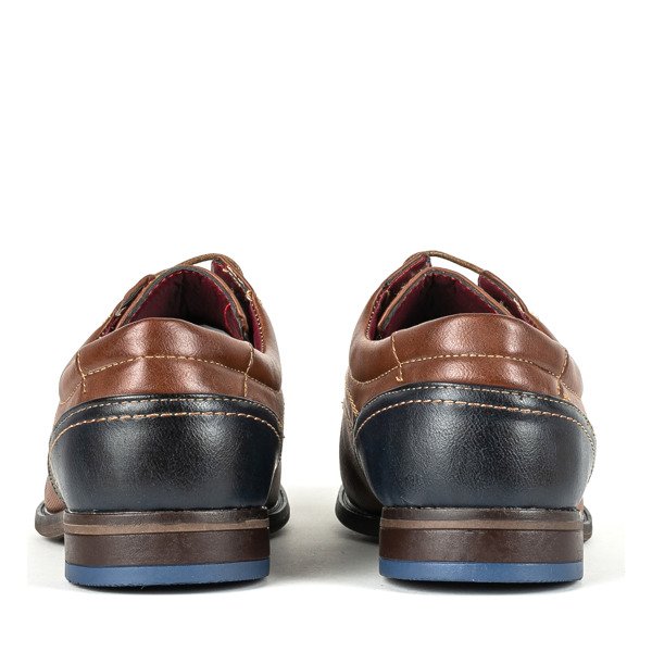 - Męskie eleganckie buty z migdałowym noskiem. Materiał wykonania cholewki to skóra eko w brązowym kolorze. W tylnej części buta granatowa wstawka. Dużym atutem jest wkładka z naturalnej skóry. Obuwie doskonałe współgra z eleganckim męskim ubiorem.