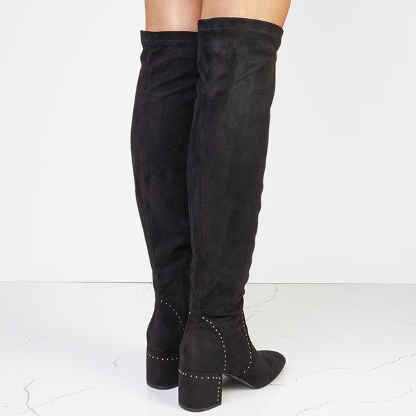 - Čižmy na stĺpiku so štvorcovou špičkou. Vyrobené z čierneho eko semišu. Stielka z prírodnej kože. Obuv sa zapína na zips. Majú ozdoby v podobe štrasov. POZNÁMKA: predná časť podrážky môže byť poškriabaná.