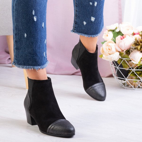 - Elegantné dámske čižmy na nízkom podpätku so zaoblenou špičkou. Zvršok je vyrobený z eko semišu. Na nose a na zadnej strane má vložky z ekokože. Model je zateplený jemnou kožušinou. Budú sa perfektne hodiť na každodenné použitie.