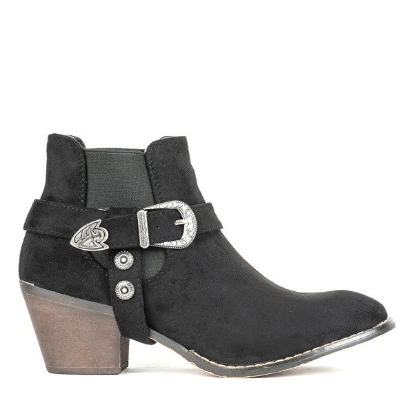 - Čierne čižmy a'la kovbojské čižmy na nízkom stĺpiku vyrobené z ekologickej semišovej kože. Nasúvací model - nemá zapínanie. Z boku ozdobná spona. Dámska obuv nemá ďalšiu izoláciu. POZNÁMKA: podpätky môžu mať mierne odlišný odtieň.