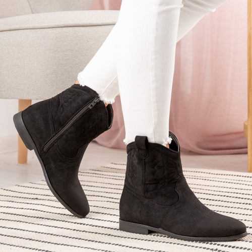 - Klasyczne kowbojki na płaskim obcasie z okrągłym noskiem. Materiał wykonania to eko-zamsz w czarnym kolorze. Obuwie jest delikatnie ocieplone futerkiem. Botki posiadają zapięcie na zamek. Buty są świetnym dodatkiem do codziennych stylizacji!