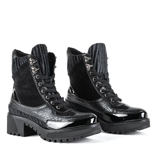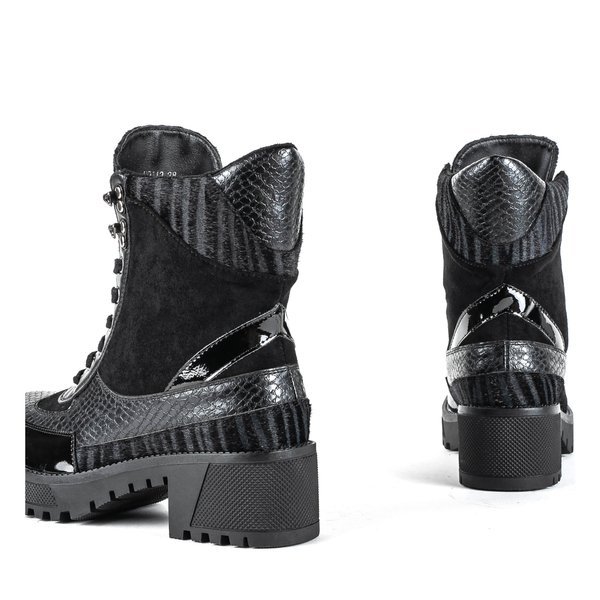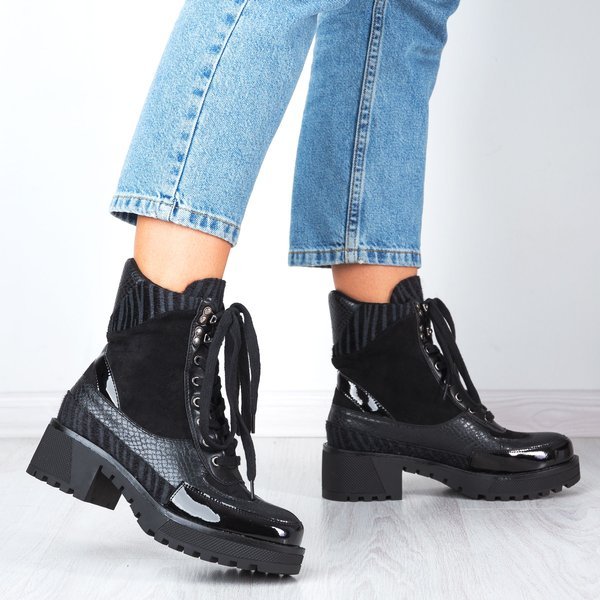 • Štýloví pracovníci na robustnom stĺpiku. Zvršok je kombináciou čierneho ekokozu a ekokože so zvieracím vzorom. Vnútro topánky je zateplené kožušinou. Čižmy majú šnurovanie. Skvelo sa hodia k nohaviciam a zimnému oblečeniu!