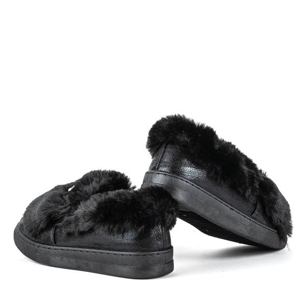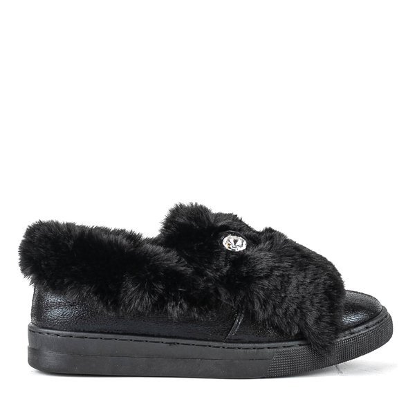 • Platformové topánky so zaoblenou špičkou. Zvršok je vyrobený z ekologickej kože nubuk v čiernej farbe. Stielka potiahnutá látkou. Horná časť topánky je zdobená kožušinou a veľkým kubickým zirkónom. Hodia sa k džínsom a elegantným nohaviciam.