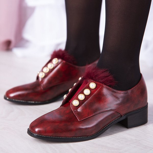 - Vkusné bordové polobotky na nízkom opätku vyrobené z ekologickej kože. Model nemá sponu. Zvršok je zdobený perlami a mäkkou kožušinou. POZNÁMKA: model môže mať na materiáli škrabance.