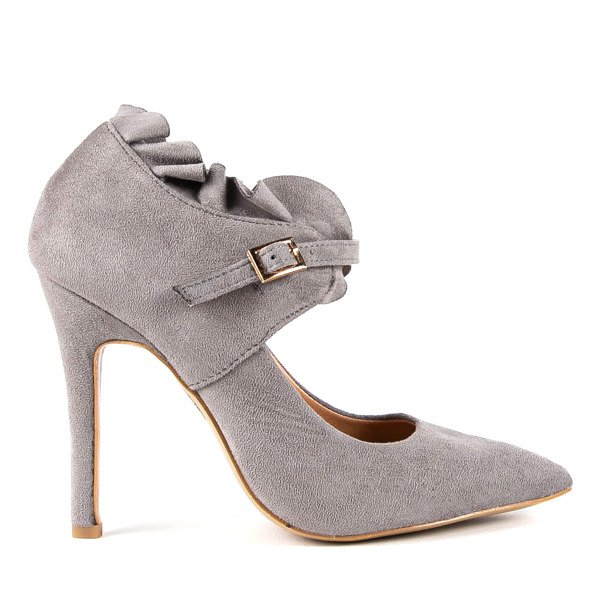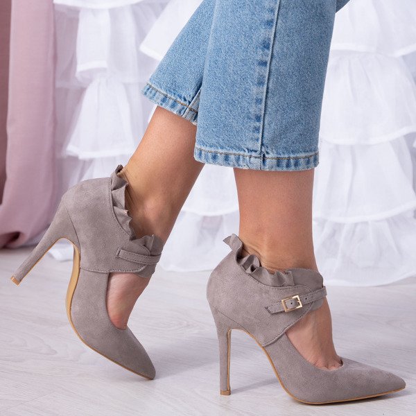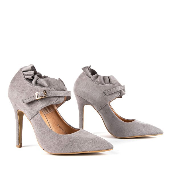 - Elegantné šedé vysoké podpätky. Materiál je vyrobený z mäkkého ekologického semišu a stielka je pokrytá ekologickou kožou. Horná časť zvršku je ukončená ozdobným riasením. Špicatý nos robí vaše nohy štíhlejšími.