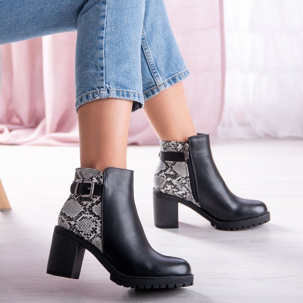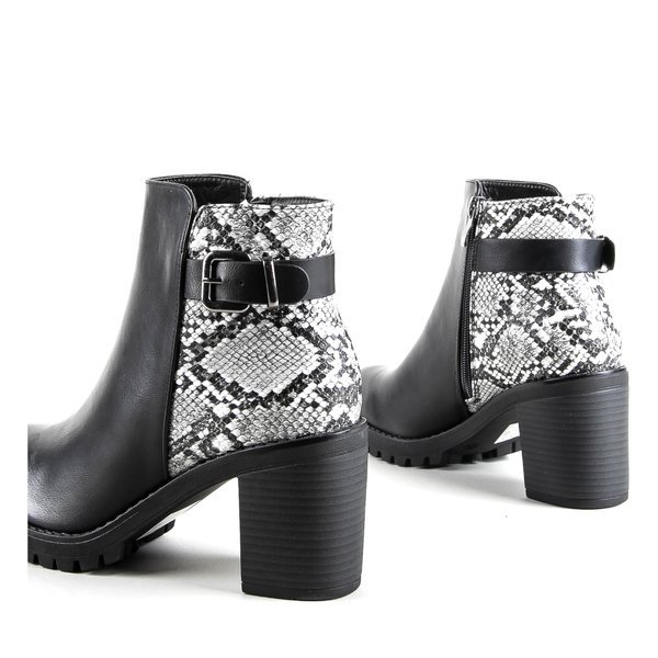- Elegantné topánky na vysokom stĺpiku. Materiál je vyrobený z ekokože v čiernej farbe. Zadná strana zvršku napodobňuje hadiu kožu. Zapínanie na zips z vnútornej strany.