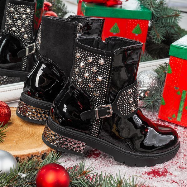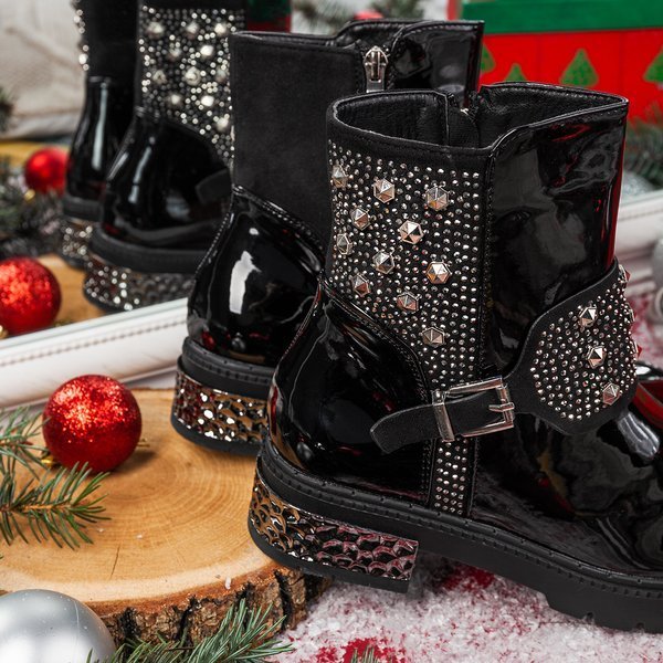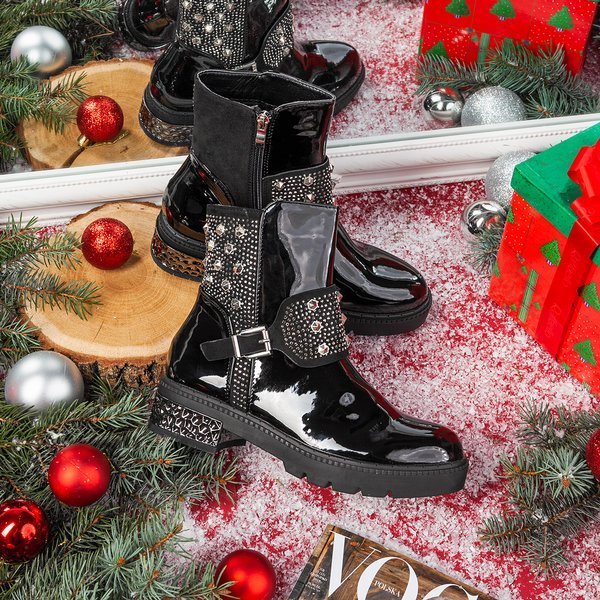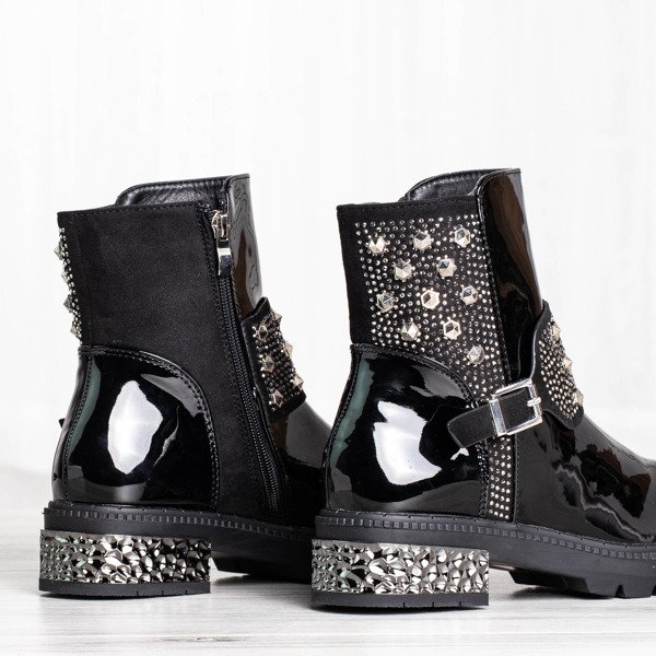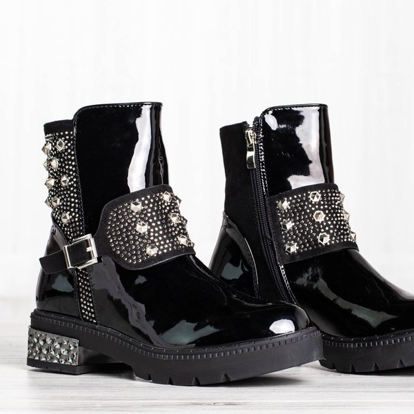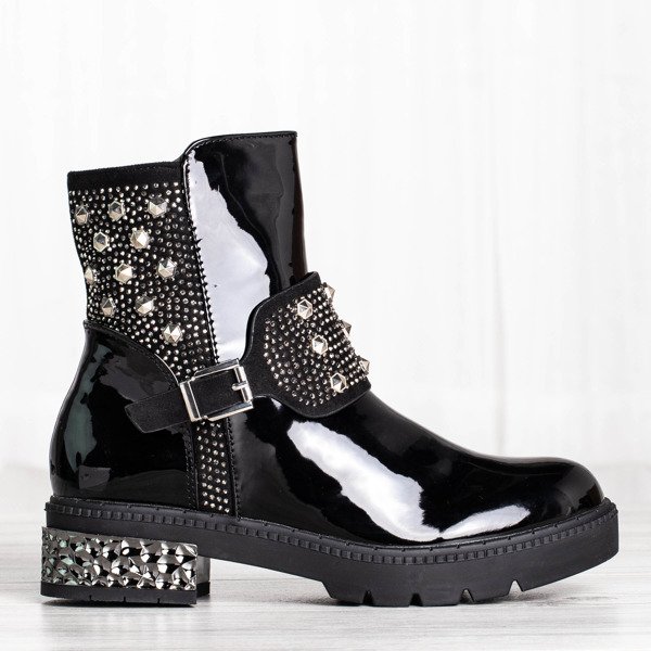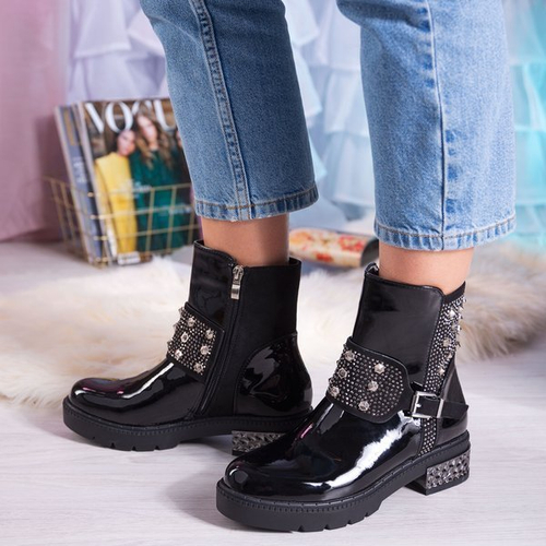 • Efektowne botki na płaskim obcasie z lakierowaną cholewką wykonaną z eko-skóry. Wnętrze buta delikatnie ocieplone futerkiem. Zapięcie na suwak po wewnętrznej stronie. Ozdoby w formie ćwieków oraz cyrkonii. Obuwie damskie na co dzień!