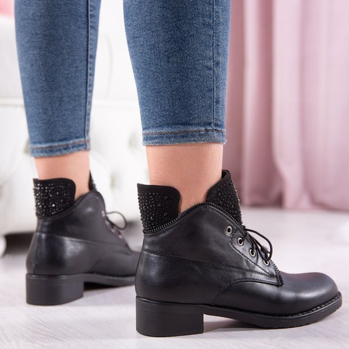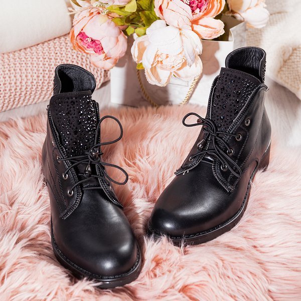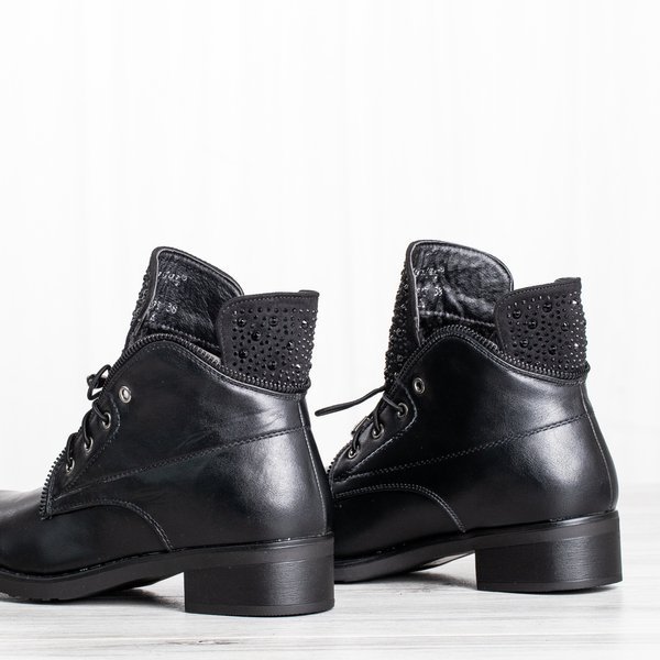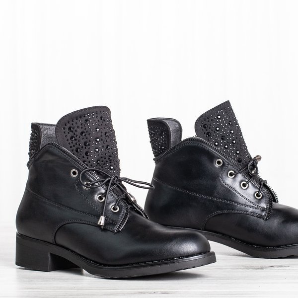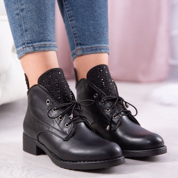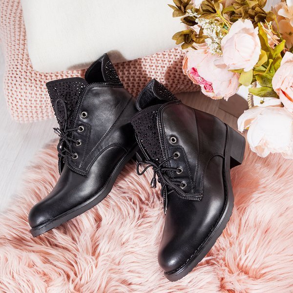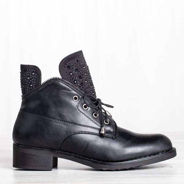 • Klasické černé ploché kotníkové boty. Svršek je vyroben z ekologické kůže. Šněrovací model. Horní část svršku a jazyk zdobí černé zirkony. Uvnitř mají jemnou izolaci ve formě kožešiny.