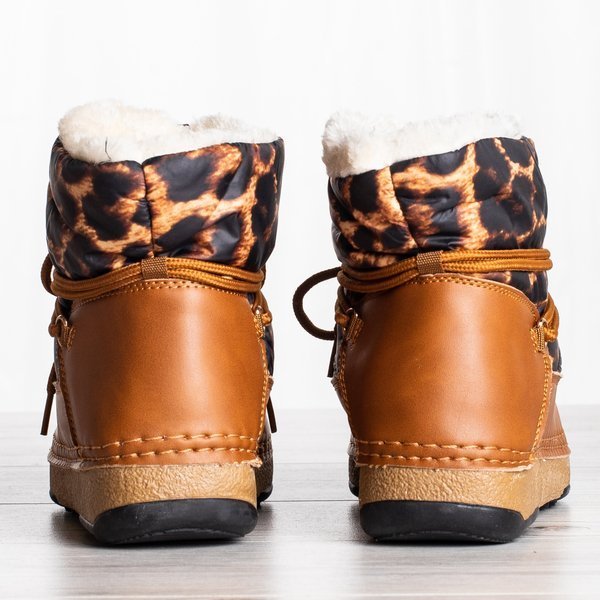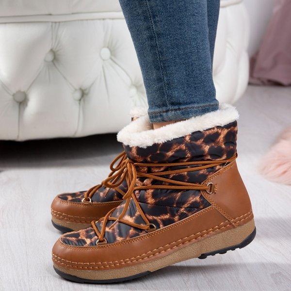 - Neuveriteľne teplé dámske snehové topánky s plochou gumovou podrážkou. Materiál je vyrobený z kombinácie ekologickej kože a hnedej látky. Zvršok je ukončený zvieracím motívom. Z vnútornej strany majú kožušinovú izoláciu.