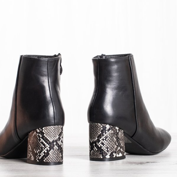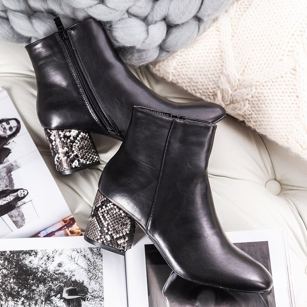 - Extrémně stylové boty na nízkém sloupku vyrobeném z ekologické kůže v černé barvě. Pata zdobená reliéfem zvířete a hadí kůží. Model se zapínáním na zip. Uvnitř mají jemnou izolaci ve formě kožešiny.