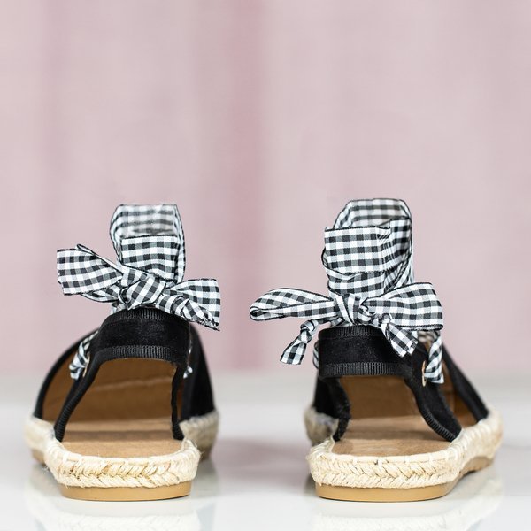 - Módne espadrilky na plochej podrážke so zaoblenou špičkou. Materiál je ekologický semiš v čiernej farbe. Stielka je pokrytá ekokožou. Podrážka je pokrytá tkanou jutovou šnúrou. Originálne viazanie okolo členku.