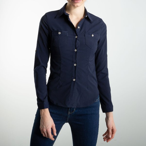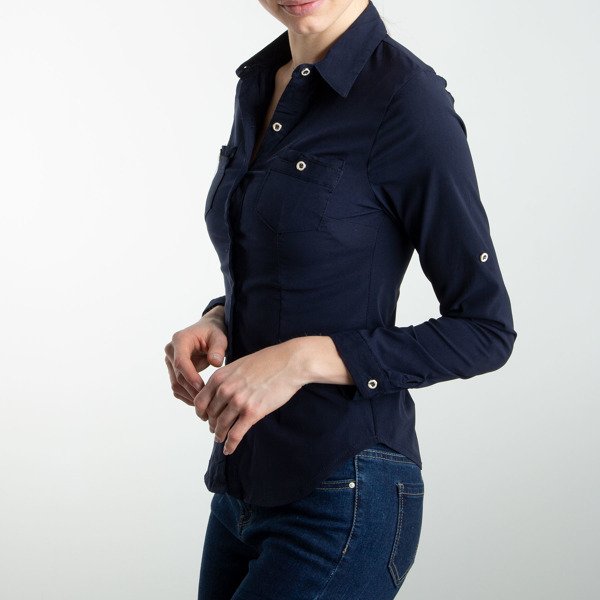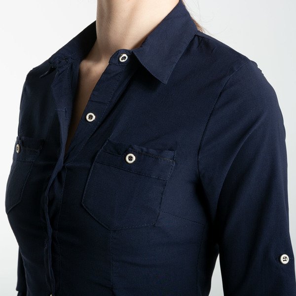 - Dámská košile vyrobená z materiálu námořnická modrá bavlna. Model je upevněn pomocí knoflíků.