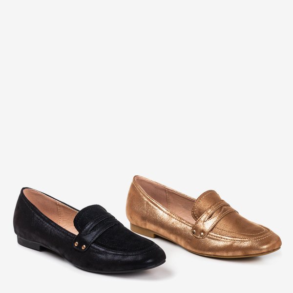 • Elegantné dámske mokasíny so štvorcovou špičkou. Čierny model s lesklým zlatým povrchom. Zvršok a stielka sú vyrobené z ekologickej kože. Na špičke vložka z ekologického semišu. Id