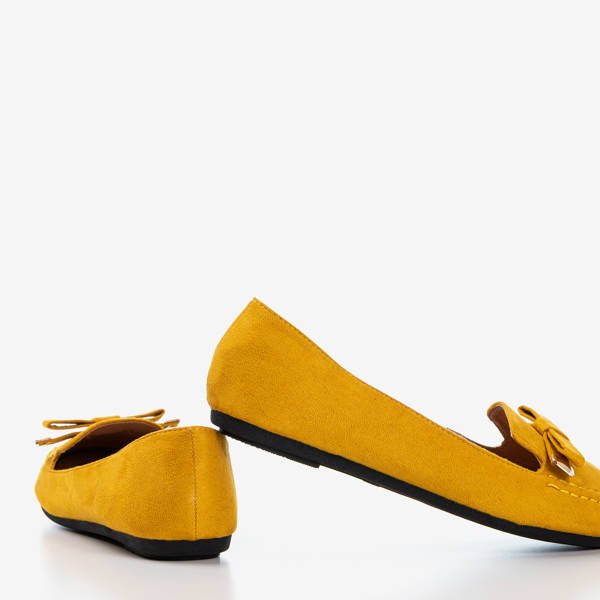- Dámske mokasíny v najjednoduchšej podobe. Zvršok je vyrobený z eko semišovej kože v horčicovej farbe. Okrúhly špic je zdobený mašličkou. Budú sa skvele kombinovať s elegantnými nohavicami a sukňami!