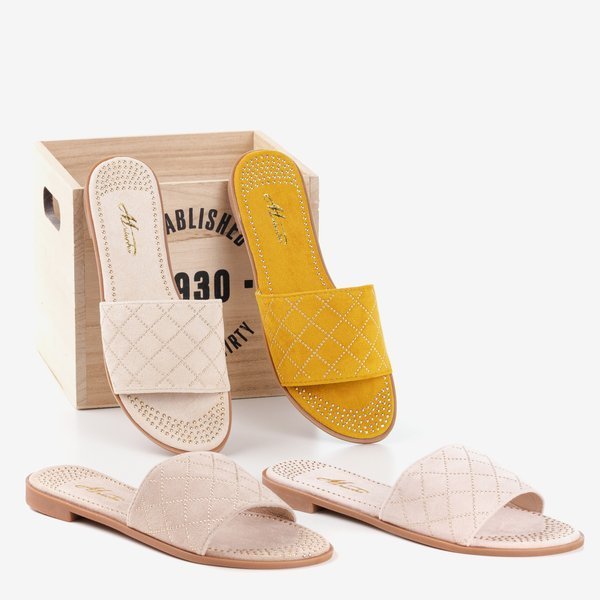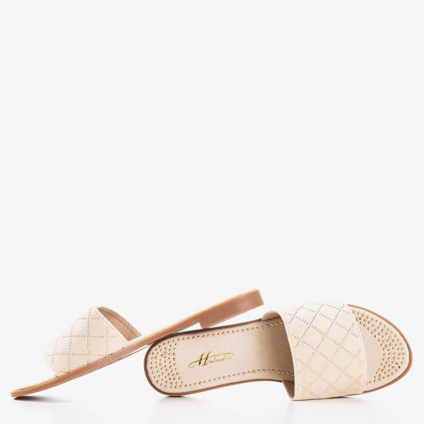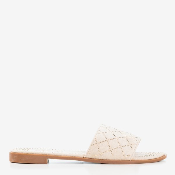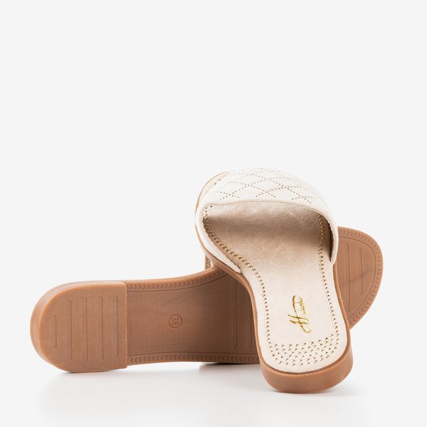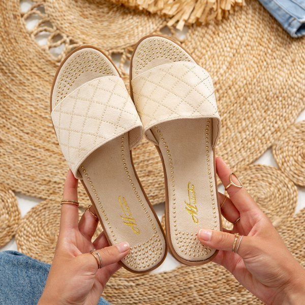 - Úžasné béžové dámské pantofle na plochém podpatku. Vyrobeno výhradně z eko semišové kůže. Władka a pás zdobený zlatými tryskami. Ideální pro nošení v horkých dnech.
