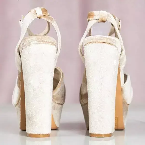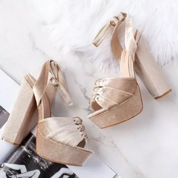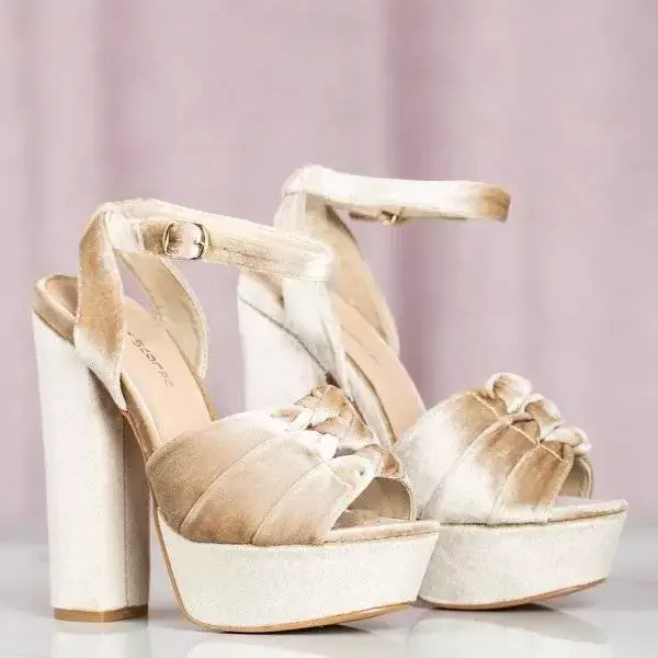 - Béžové sandále na vysokom podpätku z velúrového materiálu. Farebný model bordovej farby. Dámske topánky sa zapínajú pomocou spony na členku. Perfektné topánky na teplejšie dni. Poznámka: výrobok má na materiáli stopy lepidla.