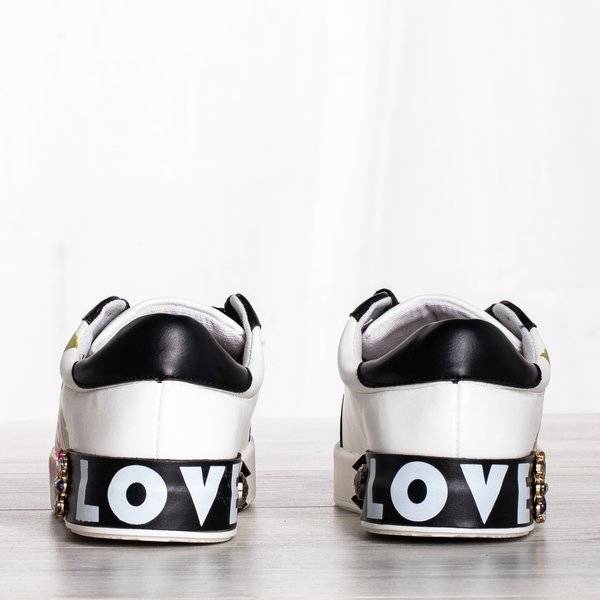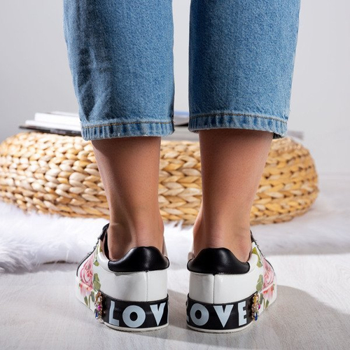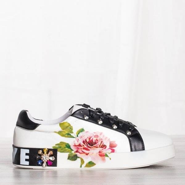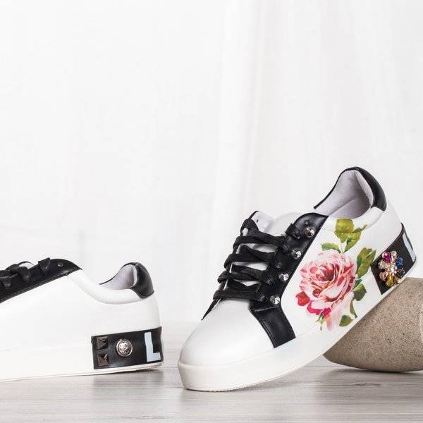 - Dámská sportovní obuv s potiskem růží. Materiál je ekologická kůže v bílé barvě. Uvnitř boty je podšívka. Na zadní straně boty nápis LOVE. Kromě toho cvočky a kamínky.