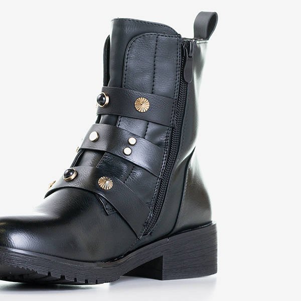 - Dámske topánky na plochom podpätku vyrobené z ekologickej kože v čiernej farbe. Vnútorná časť podšitá kožušinou. Model je zdobený zlatými prackami a špendlíkmi, zapínanie na zips. Perfektné pre rockové štylizácie!