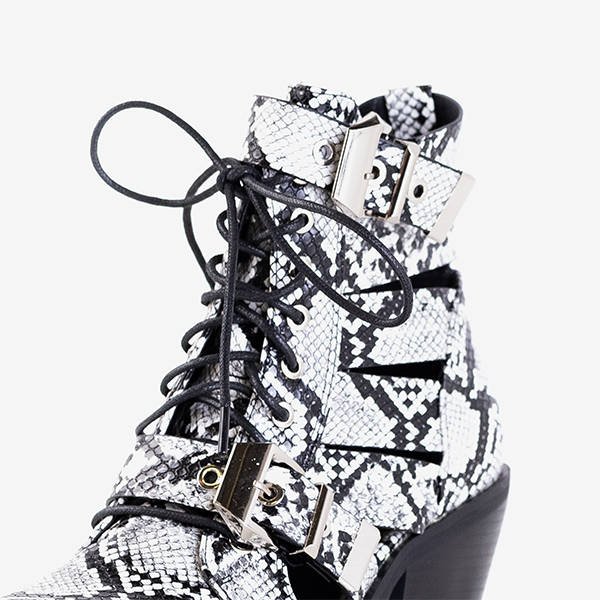 - Zábavné dámske kovbojské čižmy s farebným razením z hadej kože. Zvršok s výrezmi, má 2 ozdobné spony. Model je vyrobený z ekologickej kože, nemá žiadnu izoláciu. Budú dokonalým doplnkom vášho kabátu!