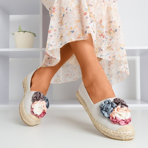 - Klasické dámské espadrily v šedé barvě. Vyrobeno z eko semišové kůže. Nos má látkové květiny. Podešev je zdobena jutovým provázkem. Látková podšívka. Ideální pro džíny