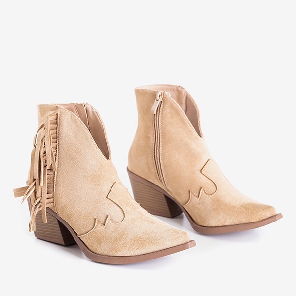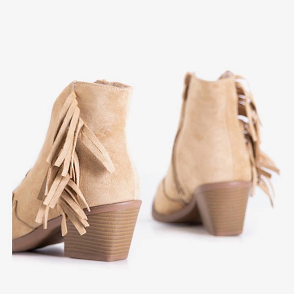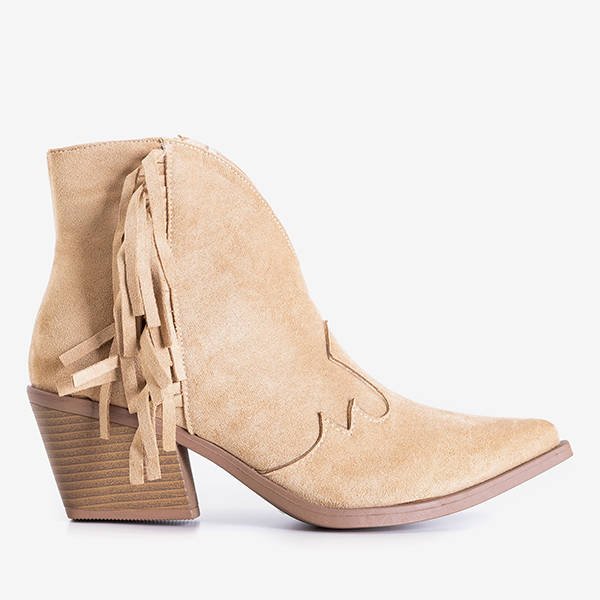 - Štýlové dámske kovbojské čižmy vyrobené z ekologickej kamzíkovej kože. Model sa zapína na zips na boku. Zvršok je zdobený strapcami, špička je zakončená špicatou špičkou. Budú skvelou dekoráciou pre každodenné štylizácie.
