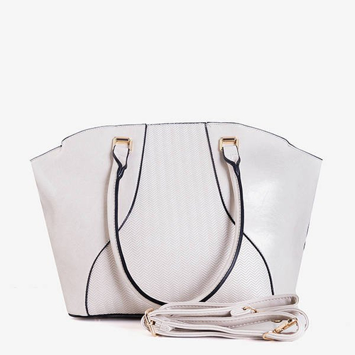 - Veľká dámska taška na rameno, vyrobená z béžovej ekokože. Materiál je zdobený ozdobnou razbou. Model na zips.