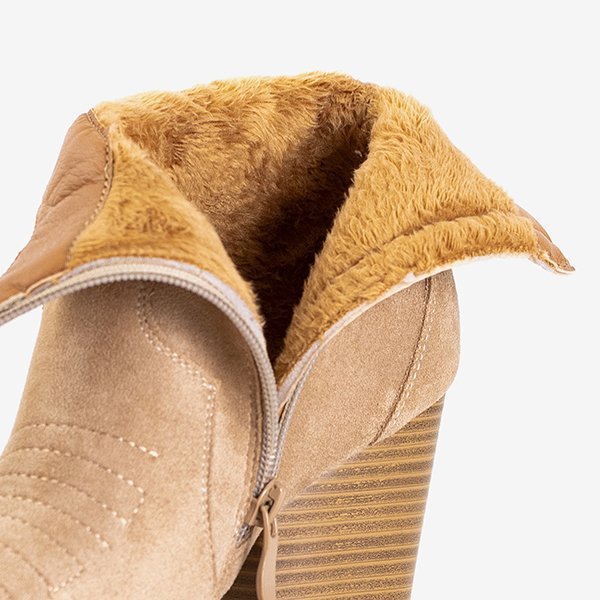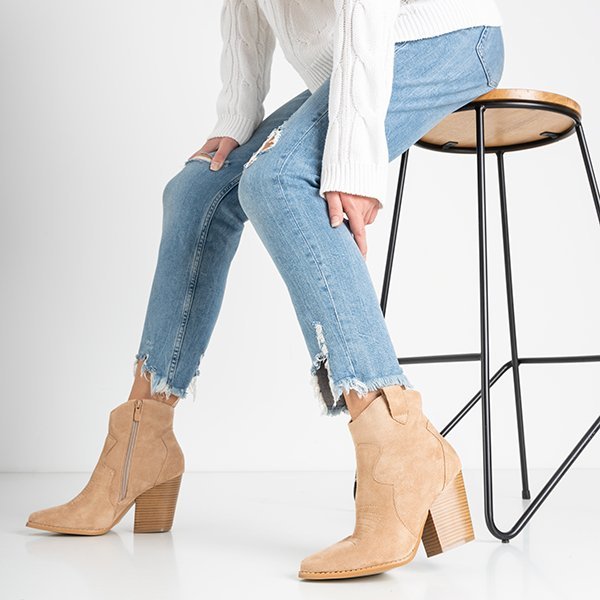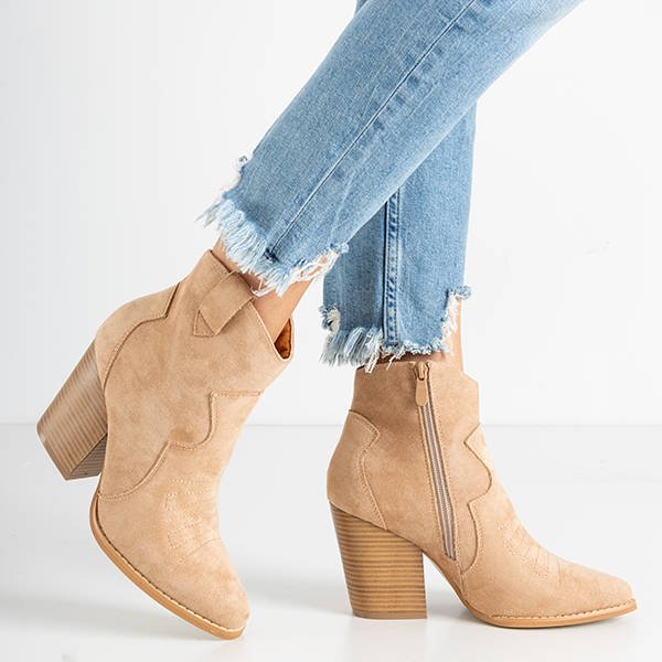 - Kovbojské topánky na vysokom stabilnom stĺpiku. Materiál zvršku je ekologický semiš v béžovej farbe. Vnútro topánky je zateplené kožušinou príjemnou na dotyk. Dámske topánky sa zapínajú na zips. Perfektné pre šaty a nohavice!