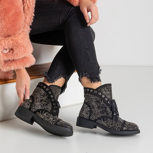 • Originálne dámske topánky s plochými podpätkami, vyrobené z eko semišovej kože. Zvršok je zdobený kubickými zirkónmi a striebornými očkami. Model je vo vnútri šnurovaný a podšitý kožušinou.