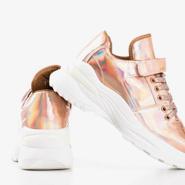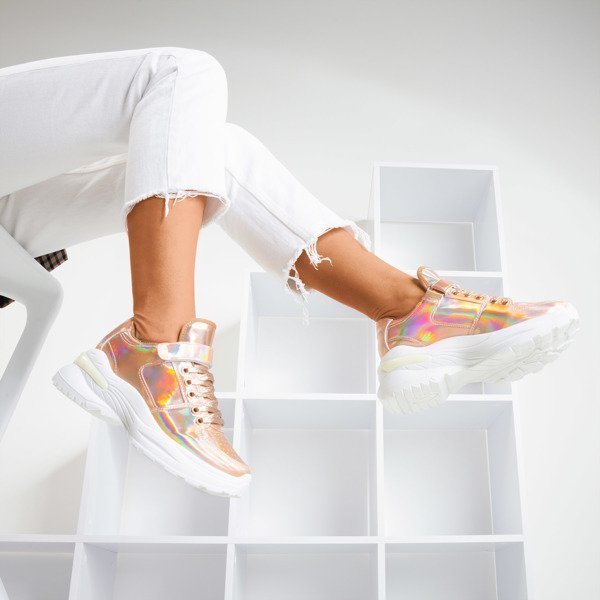 - Najmódnejšia dámska športová obuv, otecko / škaredé topánky tejto sezóny. Zvršok je vyrobený z ekologickej kože v zlato - ružovej farbe. Model s holografickou úpravou. Poznámka: výrobok má na materiáli škrabance.