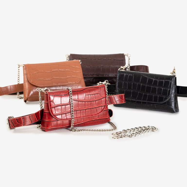 - Malá dámska kabelka na striebornej retiazke, vyrobená z ekokože a ukončená zvieracou razbou. Má dodatočnú tenšiu retiazku a nastaviteľný remienok, na ktorý môžete vak zavesiť a prenášať okolo pása.