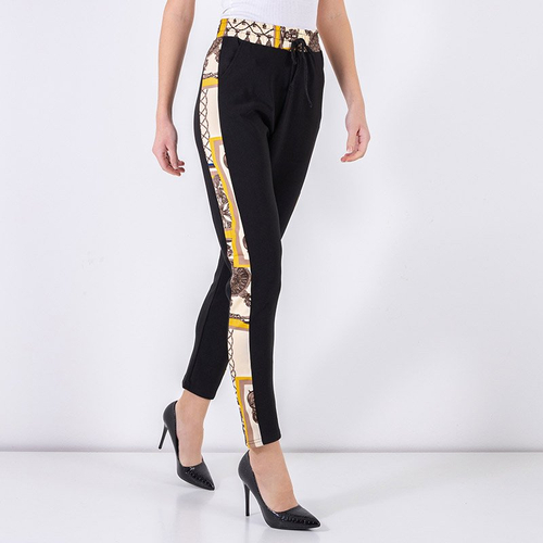 - Elegantné dámske látkové nohavice so vzorovanými vsadkami. Model má elastický pás, dve sklzové vrecká a ozdobné šnúrky. Perfektný doplnok k vašej košeli! POZNÁMKA: Presnosť merania (+/-) 1 cm.