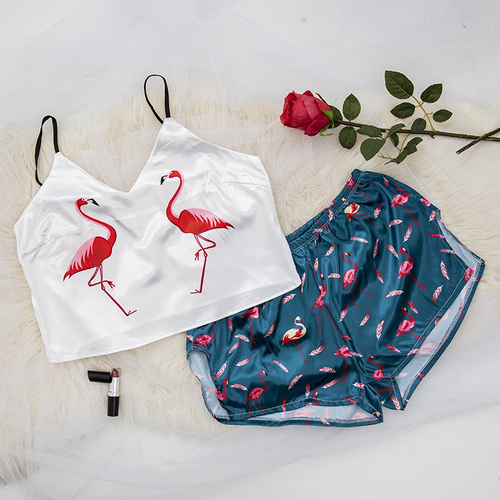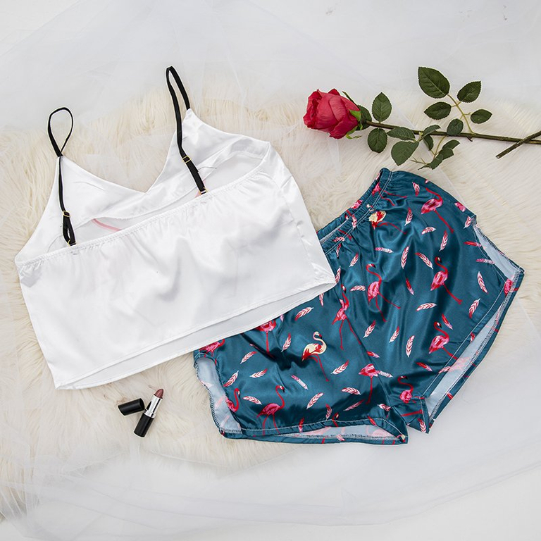 - Štýlové dámske dvojdielne pyžamo vyrobené z la saténového materiálu. Sada je zdobená originálnou potlačou plameniakov. Tričko má nastaviteľné ramienka, šortky s elastickým pásom a po bokoch výrezy. POZNÁMKA: Presnosť merania (+/-) 1 cm.